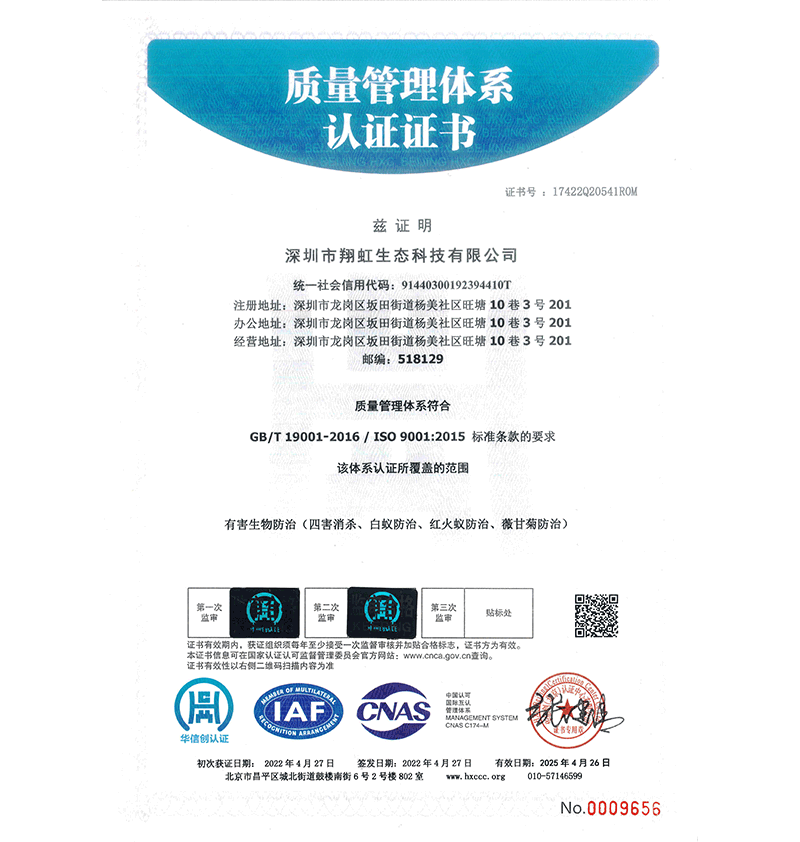 深圳市翔虹生態(tài)科技有限公司成立于1995年,是深圳最早成立的專業(yè)蟲害防治公司之一。公司發(fā)展至今獲得全國(guó)有害生物防制服務(wù)A級(jí)資質(zhì)、廣東省有害生物防制服務(wù)A級(jí)資質(zhì)、深圳市有害生物防制服務(wù)A級(jí)資質(zhì)、廣東省有害生物防制服務(wù)A級(jí)資質(zhì)、深圳市有害生物防制服務(wù)甲級(jí)資質(zhì)的單位,是中國(guó)有害生物防治協(xié)會(huì)會(huì)員、廣東省有害生物防治協(xié)會(huì)會(huì)員、深圳市有害生物防治協(xié)會(huì)理事單位,多次獲得“深圳市十佳消殺單位”榮譽(yù)。